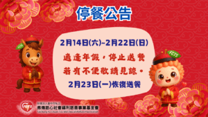 最新消息 全部消息 重要公告 活動訊息 暖心捐贈 媒體報導 趣味分享 📣 2026農曆新年假期停餐公告 📣 📢 農曆新年停餐公告 親愛的服務長輩您好: 配合 2026 ...Read More 2026 年 2 月 9 日 🥢 2026年🧧年菜募集計畫-陪伴長輩安心過好年 🍲 🥢2026 弗傳慈心基金會|年菜募集計畫 🍲農曆新年,是家...Read More 2026 年 1 月 2 日 📣 115年 1/1(四) 元旦假期停餐公告 📣 【115年 元旦假期 送餐服務公告】 親愛的服務長輩及弗傳慈...Read More 2025 年 12 月 29 日 📣 12/25(四) 行憲紀念日停餐公告 📣 【行憲紀念日 送餐服務公告】 親愛的長輩與關心我們的朋友您好...Read More 2025 年 12 月 22 日 📣 10/24(五)~10/26(日) 光復節連假停餐公告 📣 【臺灣光復節暨金門古寧頭大捷紀念日 送餐服務公告】 親愛的服...Read More 2025 年 10 月 22 日 📣 10/10(五)~10/12(日) 雙十節連假停餐公告 📣 【雙十節連假停餐公告】✨ 親愛的服務對象與家屬您好: 適逢 ...Read More 2025 年 10 月 7 日 📣 10/4(六)~10/06(一) 中秋節連假停餐公告 📣 🌕【2025中秋節停餐服務公告】🍱✨ 親愛的慈心家人們,您好...Read More 2025 年 10 月 2 日 📣 09/27(六)~09/29(一) 教師節連假停餐公告 📣 2025年教師節連假停餐公告 弗傳慈心基金會送餐服務 每年的...Read More 2025 年 9 月 24 日 📣 5/30~6/01 端午連假停餐公告 📣 📣5/30~6/01 端午連假停餐公告📣 🌼弗傳慈心也將於端...Read More 2025 年 5 月 26 日 📣 5/1勞動節停餐公告 📣 📣5/1勞動節停餐公告📣 在這個日子,讓我們向每一位默默付出...Read More 2025 年 4 月 29 日 📣 4/3~4/6清明連假停餐公告 📣 【📢4/3~4/6清明連假停餐公告📢】 親愛的長輩們與關心我...Read More 2025 年 3 月 31 日 📣 228連續假期停餐公告 📣 【📢228連續假期停餐公告📢】 親愛的長輩們與關心我們的朋友...Read More 2025 年 2 月 25 日 📣 過年假期停餐公告 📣 【📢 過年假期停餐公告 📢】 親愛的服務長輩們,因應過年連續...Read More 2025 年 1 月 24 日 📣 元旦假期停餐公告 📣 【📢元旦假期停餐公告📢】 親愛的服務長輩們,由於元旦假期,本...Read More 2024 年 12 月 31 日 🥢 年菜募集 為長輩端上一桌團圓的溫暖 🍲 🥢 年菜募集 為長輩端上一桌團圓的溫暖 🍲 在歲末寒冬裡...Read More 2024 年 11 月 22 日 Load More