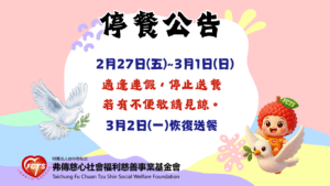 最新消息 全部消息 重要公告 活動訊息 暖心捐贈 媒體報導 趣味分享 📣 228連續假期停餐公告 📣 📢 228連續假期停餐公告 親愛的服務長輩您好: 因應 11...Read More 2026 年 2 月 23 日 📣 2026農曆新年假期停餐公告 📣 📢 農曆新年停餐公告 親愛的服務長輩您好: 配合 2026 ...Read More 2026 年 2 月 9 日 🏠❤️ 2026歲末圍爐活動 ❤️🏠 【活動紀實】獅情聚福、祥聚圍爐 陪伴長輩共度暖心年節 日期:...Read More 2026 年 1 月 26 日 🌼 幸福A+日照中心|寒冬裡的一碗薑湯,暖暖陪伴阿公阿嬤 https://youtube.com/shorts/_RC...Read More 2026 年 1 月 9 日 🥢 2026年🧧年菜募集計畫-陪伴長輩安心過好年 🍲 🥢2026 弗傳慈心基金會|年菜募集計畫 🍲農曆新年,是家...Read More 2026 年 1 月 2 日 📣 115年 1/1(四) 元旦假期停餐公告 📣 【115年 元旦假期 送餐服務公告】 親愛的服務長輩及弗傳慈...Read More 2025 年 12 月 29 日 📣 12/25(四) 行憲紀念日停餐公告 📣 【行憲紀念日 送餐服務公告】 親愛的長輩與關心我們的朋友您好...Read More 2025 年 12 月 22 日 《ĀnkěCare創新照顧》報導:翻轉孤老、在地善終 弗傳慈心推「日照安寧 」 📣【媒體報導】 弗傳慈心基金會以「日照+安寧照護」創新服務 ...Read More 2025 年 11 月 18 日 🌟 台新銀行公益慈善基金會【第16屆 您的一票,決定愛的力量】活動開跑啦!🌟 💖 第16屆《您的一票,決定愛的力量》投票活動開跑! 🌸 提...Read More 2025 年 11 月 3 日 📣 10/24(五)~10/26(日) 光復節連假停餐公告 📣 【臺灣光復節暨金門古寧頭大捷紀念日 送餐服務公告】 親愛的服...Read More 2025 年 10 月 22 日 📣 10/10(五)~10/12(日) 雙十節連假停餐公告 📣 【雙十節連假停餐公告】✨ 親愛的服務對象與家屬您好: 適逢 ...Read More 2025 年 10 月 7 日 📣 10/4(六)~10/06(一) 中秋節連假停餐公告 📣 🌕【2025中秋節停餐服務公告】🍱✨ 親愛的慈心家人們,您好...Read More 2025 年 10 月 2 日 📣 09/27(六)~09/29(一) 教師節連假停餐公告 📣 2025年教師節連假停餐公告 弗傳慈心基金會送餐服務 每年的...Read More 2025 年 9 月 24 日 ❤️善的循環|仕元代天府 × 明修善堂 × 弗傳慈心基金會 共築社區愛心廚房 信仰的善念 × 慈心的行動|仕元代天府與明修善堂走進愛心廚房...Read More 2025 年 8 月 5 日 【感謝❤️臺中市五傑聯合同心會❤️的參訪與支持】 【感謝 臺中市五傑聯合同心會 的參訪與支持】 當天,五傑聯合...Read More 2025 年 7 月 28 日 Load More