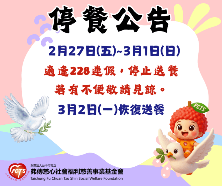 📢 228連續假期停餐公告 親愛的服務長輩您好: 因應 115 年 228 連續假期,本會送餐服務將暫停辦理,造成不便之處,敬請見諒。 📅 停餐日期:115/02/27(五) 🥗 恢復送餐:115/03/02(一) 🔔 溫馨提醒:假期期間請多留意自身健康與安全,適時添衣保暖,好好照顧自己。 弗傳慈心基金會 敬祝平安健康 ❤️ 上一頁Previous📣 2026農曆新年假期停餐公告 📣